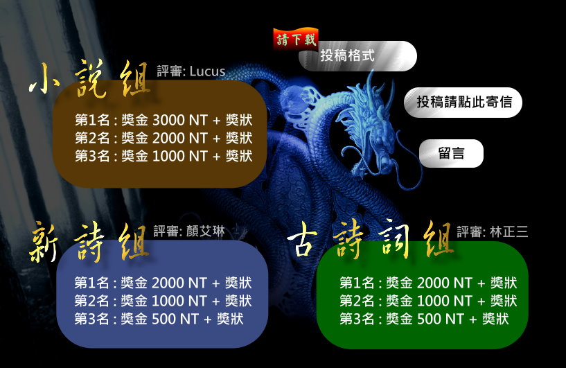 - 得獎作品將於舞劍壇網站及出版書籍中展出,舞劍壇創作人擁有作品全部智慧財產權,作者應於事前簽署同意書授權主辦單位使用,且不行使著作人格權,但同意作者可以複製方式保留作品。對於得獎作品,主辦單位保有修改權。