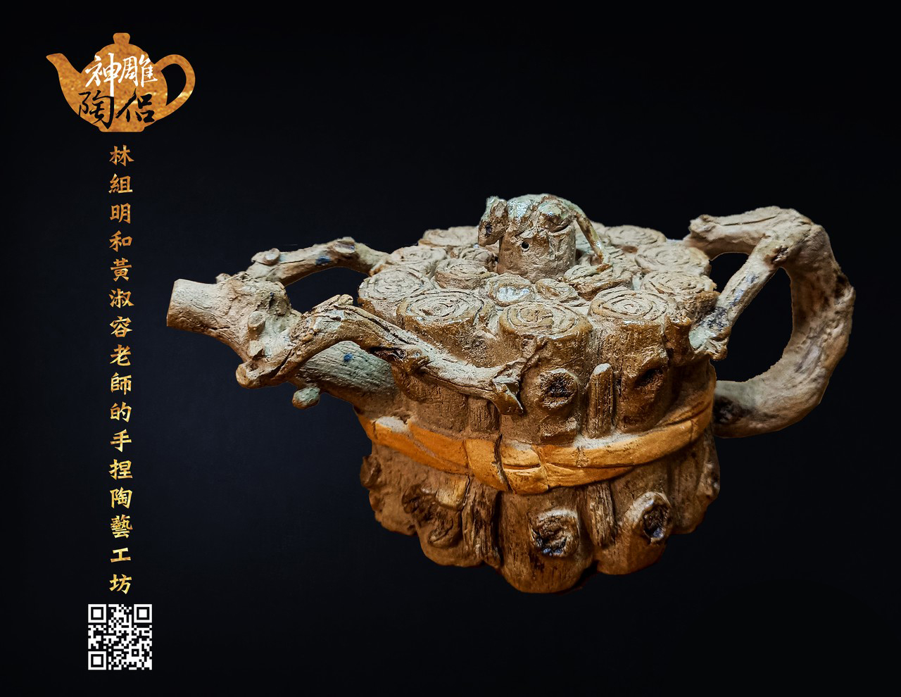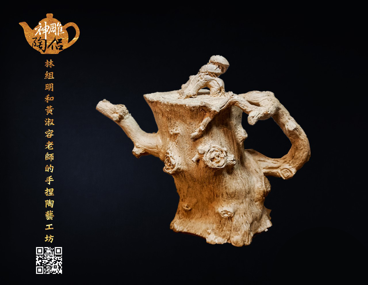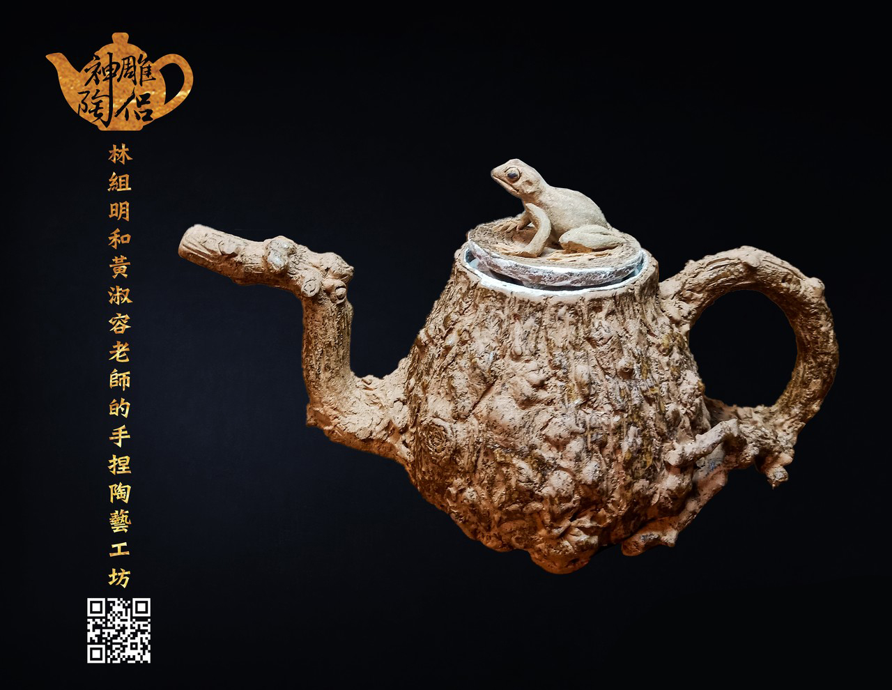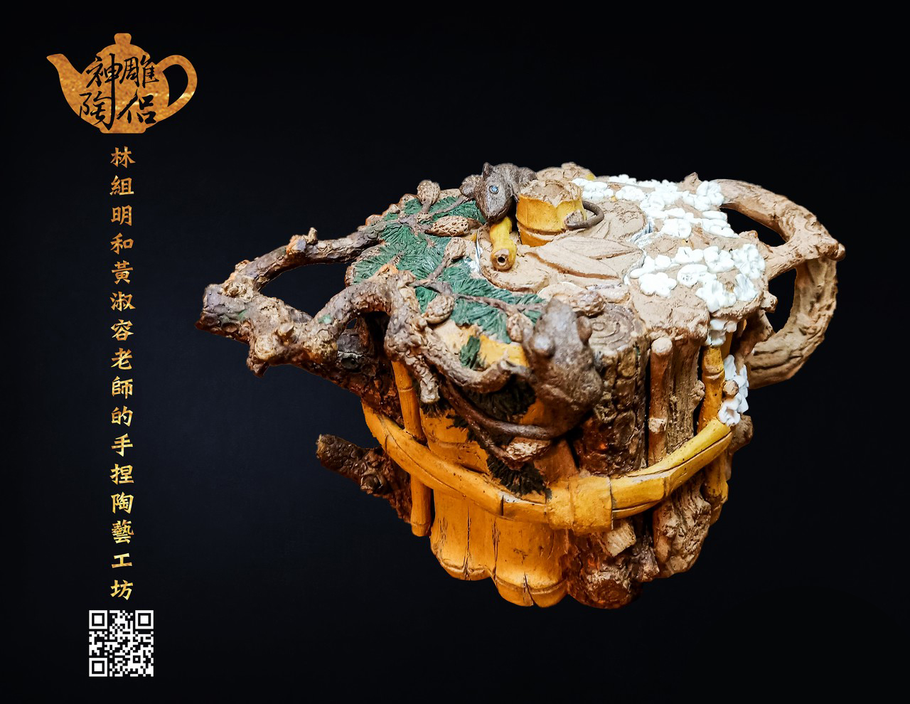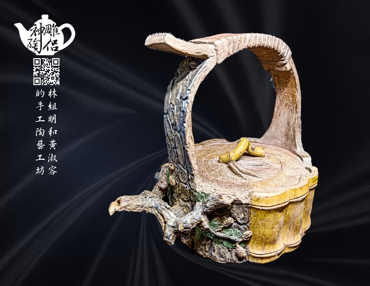 林組明老師的手捏茶壺作品,模仿自然界萬物,維妙維肖,朽木、殘竹、昆蟲鳥魚皆可入形為陶,作品造形精巧、多變化又討喜,每一件陶藝作品皆是花費多時親手製作、獨一無二,是台灣相當具有特色的陶藝作品。