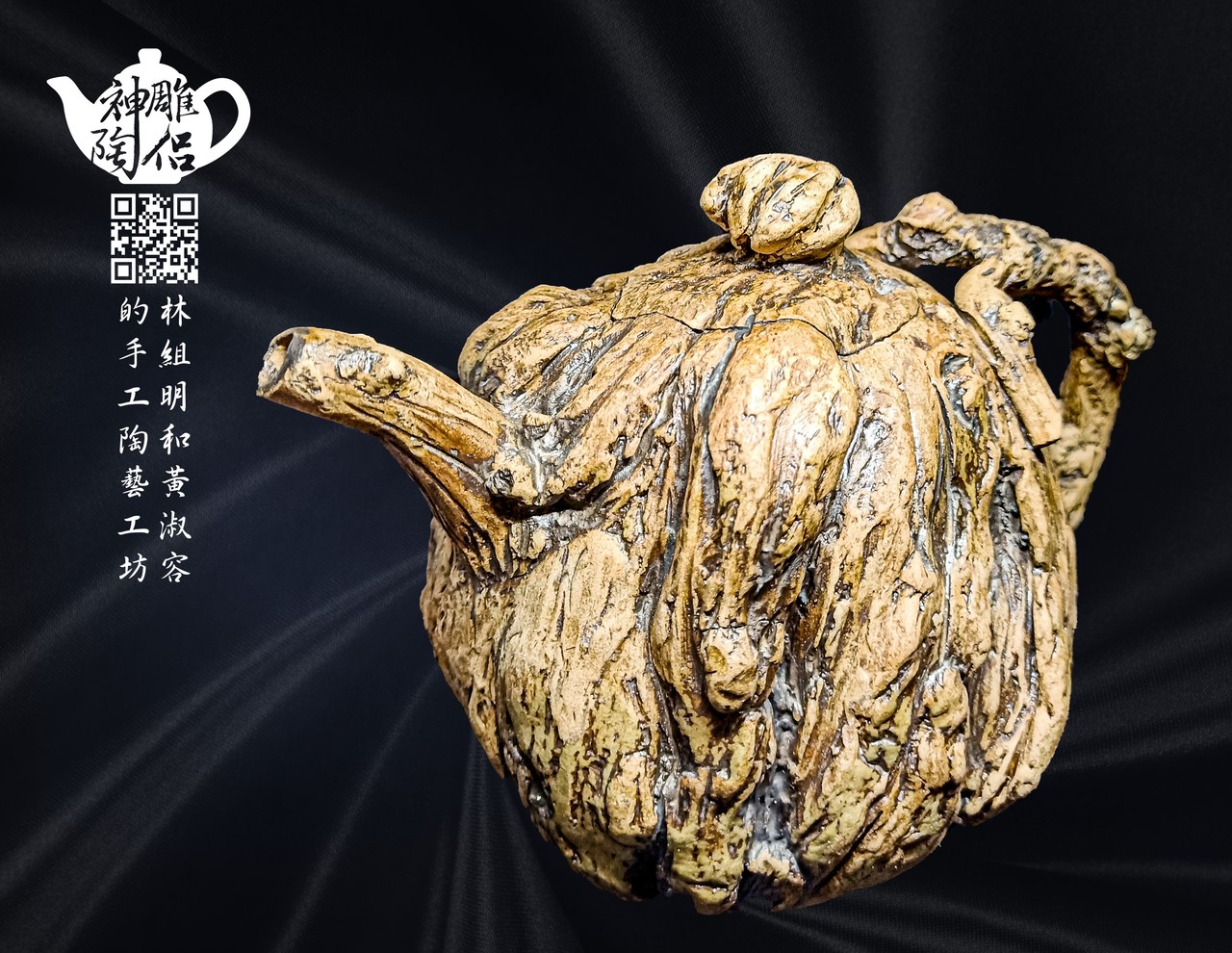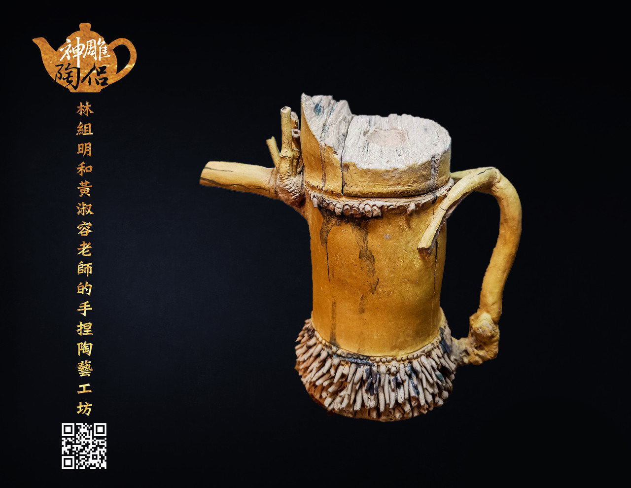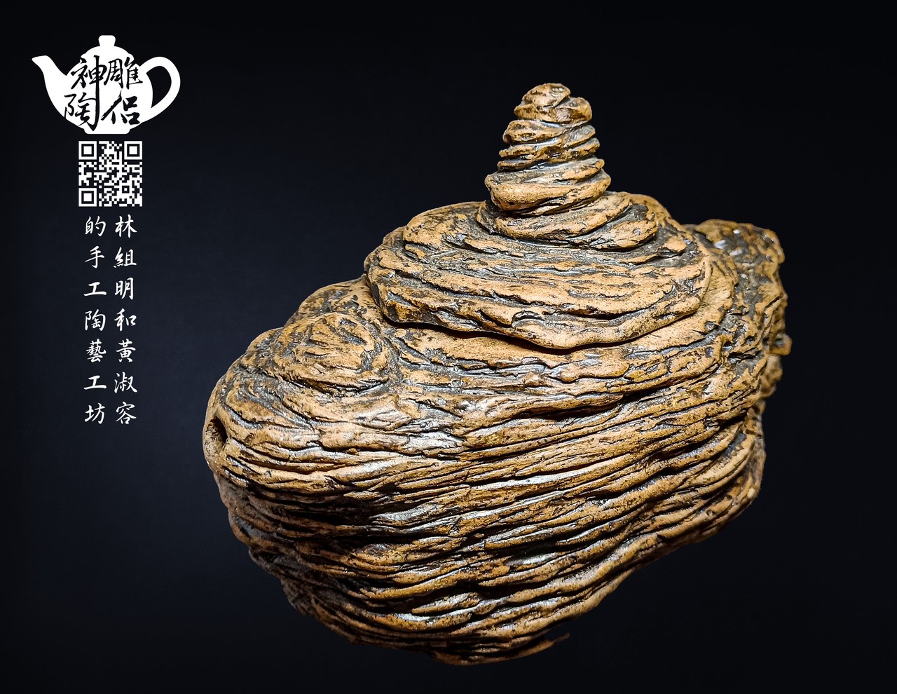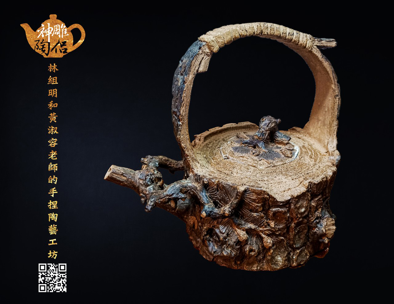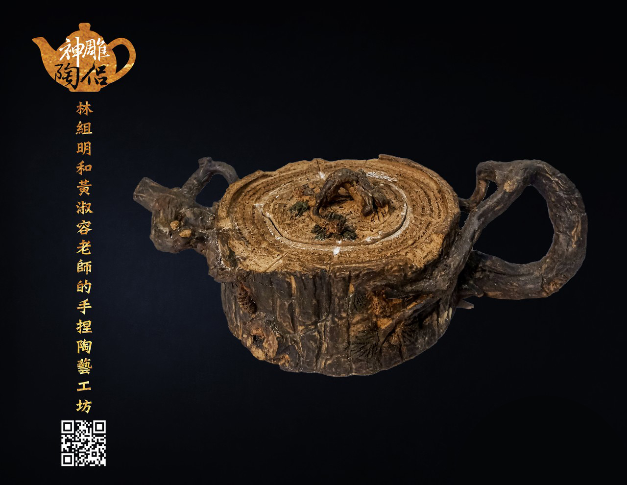 林組明老師的手捏茶壺作品,模仿自然界萬物,維妙維肖,朽木、殘竹、昆蟲鳥魚皆可入形為陶,作品造形精巧、多變化又討喜,每一件陶藝作品皆是花費多時親手製作、獨一無二,是台灣相當具有特色的陶藝作品。