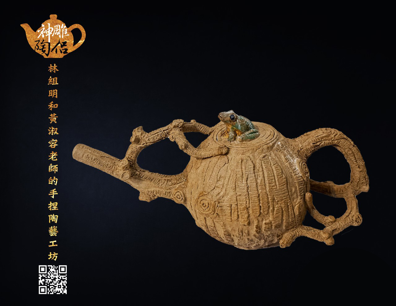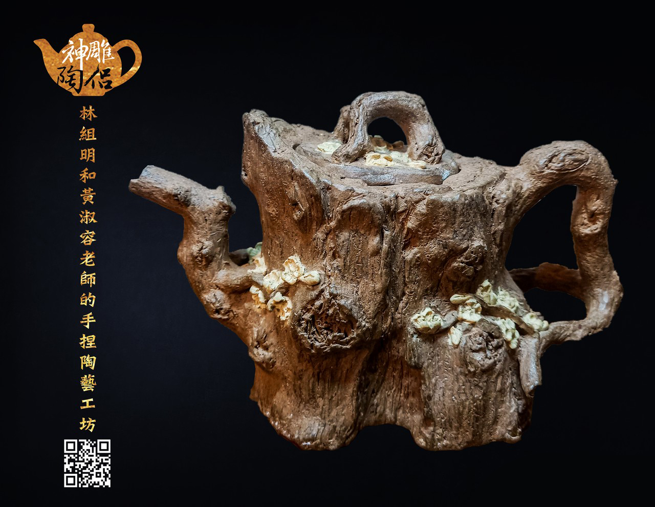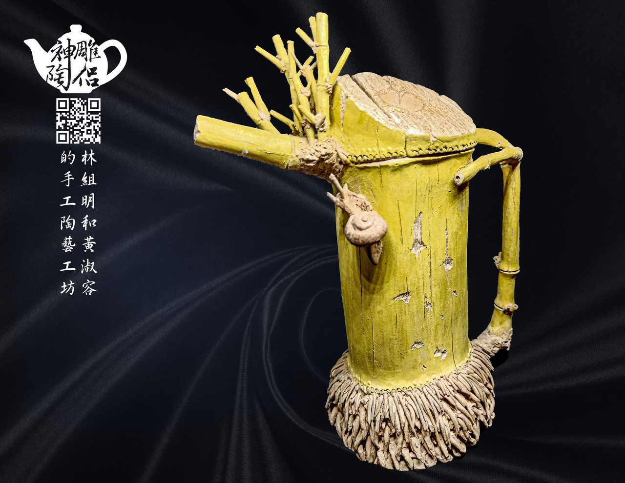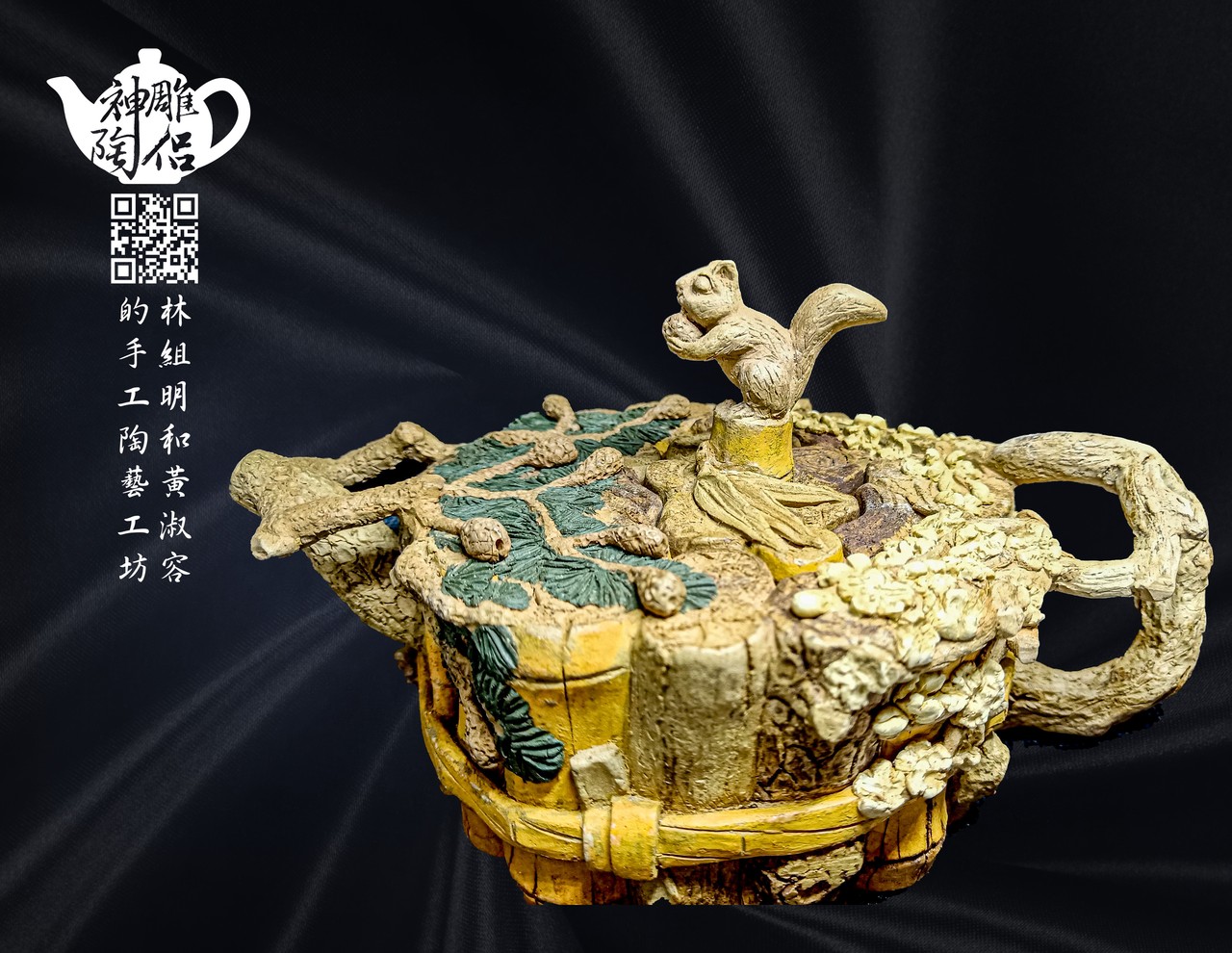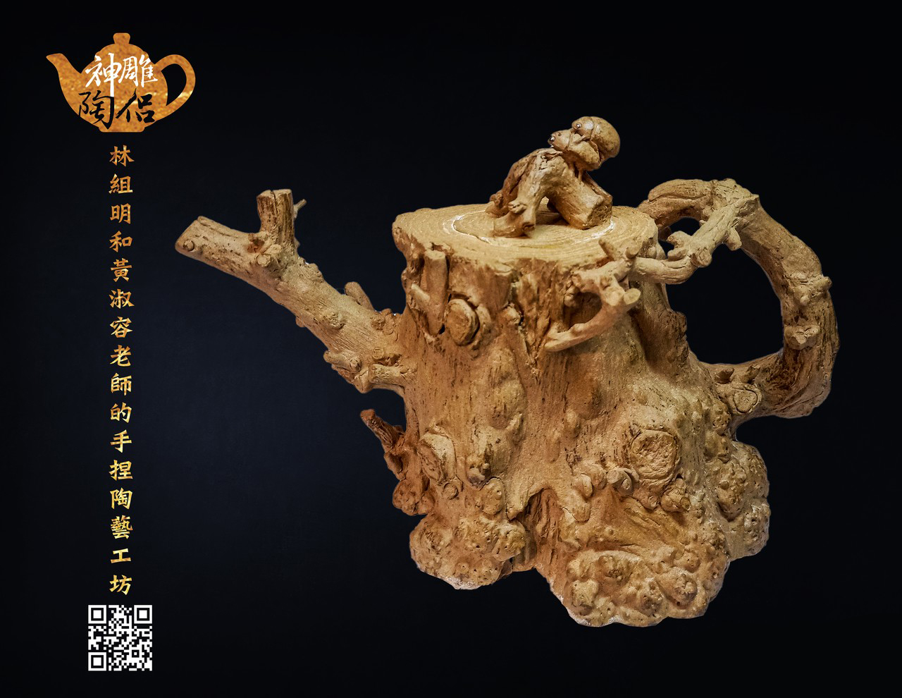 林組明老師的手捏茶壺作品,模仿自然界萬物,維妙維肖,朽木、殘竹、昆蟲鳥魚皆可入形為陶,作品造形精巧、多變化又討喜,每一件陶藝作品皆是花費多時親手製作、獨一無二,是台灣相當具有特色的陶藝作品。